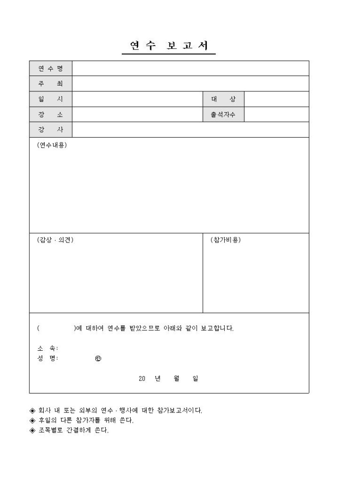연수명, 주최, 일시, 장소, 강사, 대상, 출석자수, 연수내용, 감상/의견, 참가비용 등의 항목으로 구성된 연수 보고서 양식입니다.