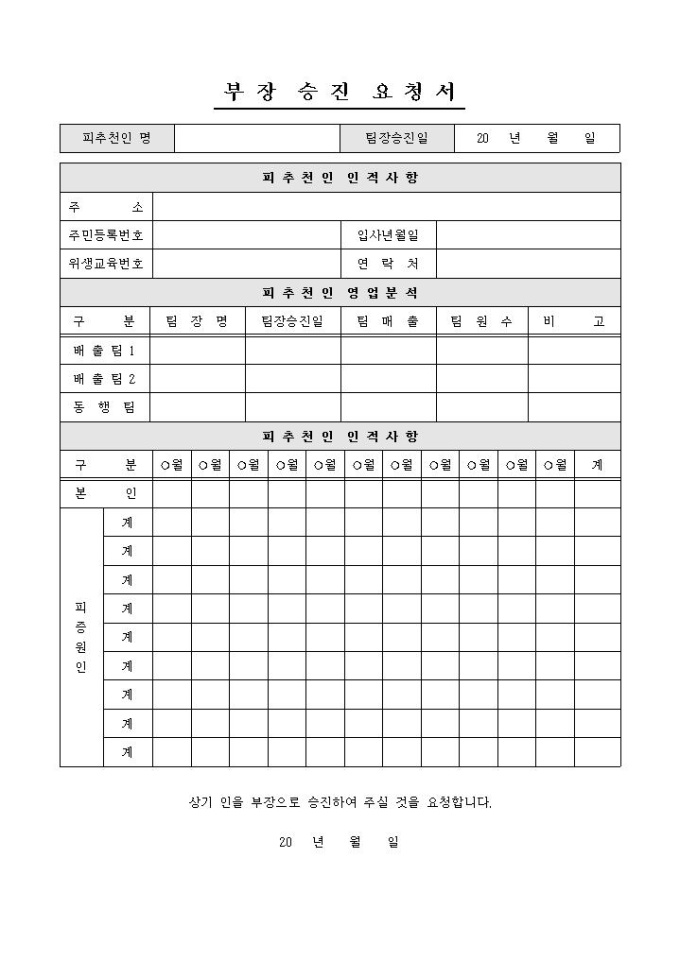 피추천인 인적사항, 피추천인 영업분석 등의 항목으로 구성된 부장 승진 요청서 양식입니다.