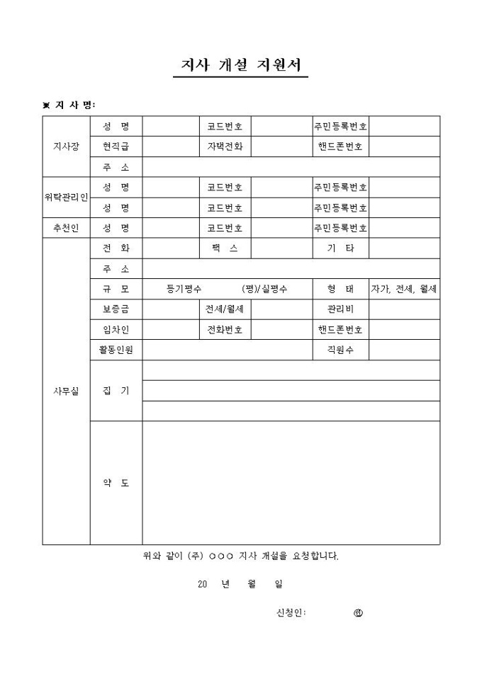 지사장, 위탁관리인, 추천인, 사무실 등의 항목으로 구성된 지사 개설 지원서 양식입니다.
