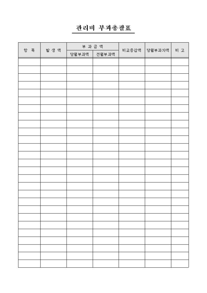 항목, 발생액, 부과금액, 비교증감액, 당월부과차액, 비고의 항목으로 구성된 관리비 부과총괄표 양식입니다.