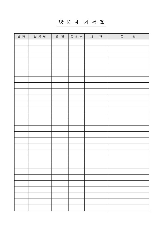 날짜, 회사명, 성명, 동호수, 시간, 목적의 항목으로 구성된 회사 방문자 기록표 양식입니다.