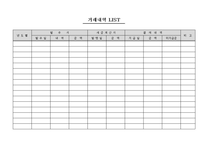 년도별, 발주서, 세금계산서, 결제내역, 비고 등의 항목으로 구성되어 있는 거래내역 LIST 양식입니다.