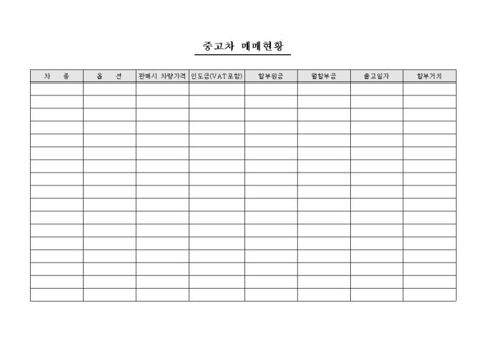 차종, 옵션, 판매시 차량가격, 인도금, 할부원금, 월할부금, 출고일자, 할부거치의 항목으로 구성된 중고차 매매현황 양식입니다.