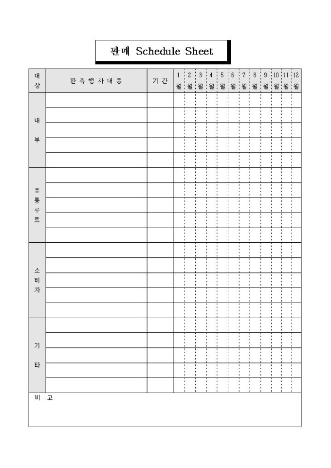 대상, 판촉행사내용, 기간의 항목을 월별로 기록할 수 있는 판매 Schedule Sheet 양식입니다.