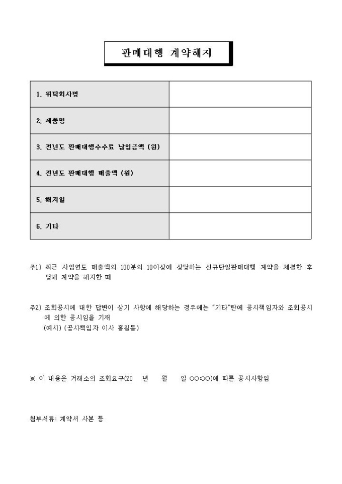 9,000원/월위탁회사명, 제품명, 전년도 판매대행수수료 납입금액, 전년도 판매대행 매출액, 해지일, 기타의 항목 등으로 구성된 계약해지 통지서(판매대행) 양식입니다.
