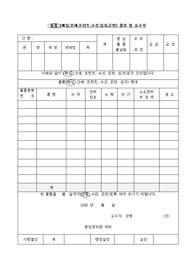 결재란에 행정실장,교장의 서명을 받아야 하는 물품,품의요구서입니다.