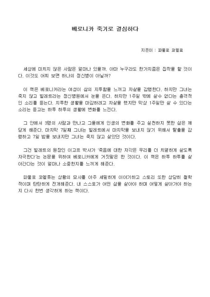 이 책은 베로니카라는 여성이 삶의 지루함을 느끼고 자살을 감행한다.