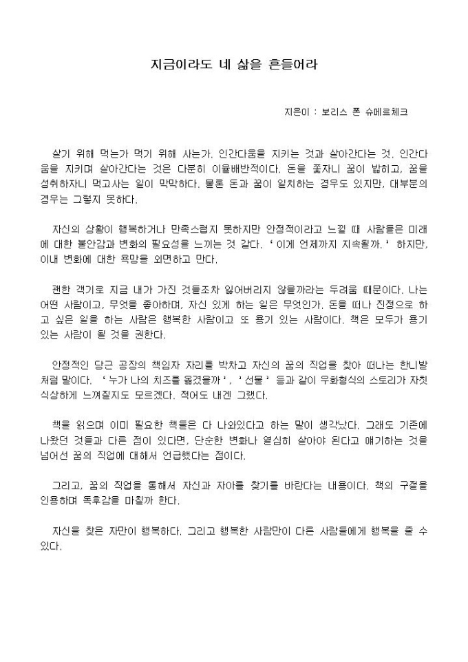 자신의 상황이 행복하거나 만족스럽지 못하지만 안정적이라고 느낄 때 사람들은 미래에 대한 불안감과 변화의 필요성을 느끼는 것 같다. ‘이게 언제까지 지속될까.’ 하지만, 이내 변화에 대한 욕망을 외면하고 만다.
