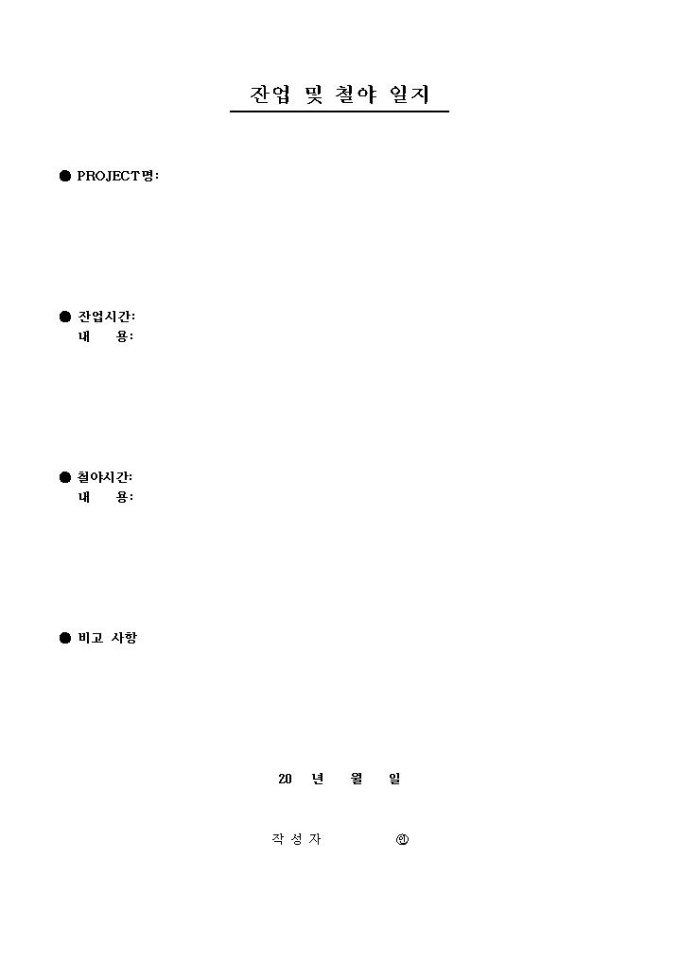 9,000원/월잔업 및 철야 근무에 대한 내용을 기록할 때 사용하는 잔업 및 철야 일지 양식입니다. 프로젝트명, 잔업시간내용, 철야시간내용, 비고사항의 항목으로 구성되어있습니다.