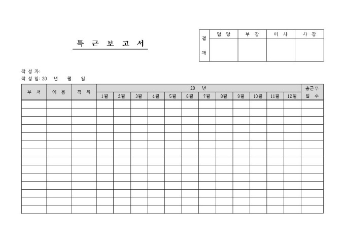 9,000원/월특근에 대한 내역을 기록/ 보고하고자 할 때 사용하는 특근보고서 양식입니다. 부서, 이름, 직위, 월 등의 항목으로 구성되어있습니다.