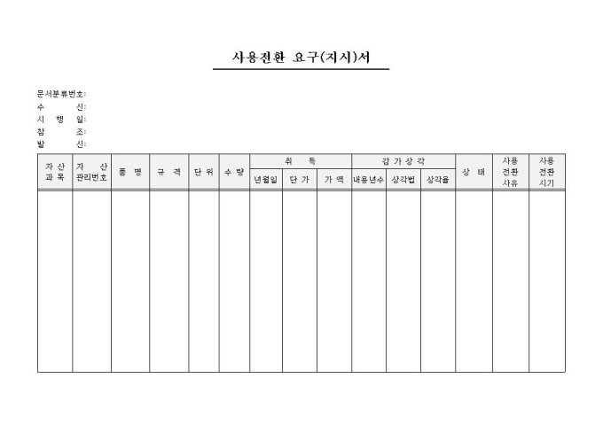 9,000원/월자산에 대해 사용전환을 요구(지시)할 때 사용하는 사용전환 요구(지시)서 양식입니다. 자산과목, 자산관리번호, 품명, 규격, 단위, 수량, 취득, 감가상각, 상태, 사용전환유무, 사용전환시기의 항목으로 구성되어있습니다.