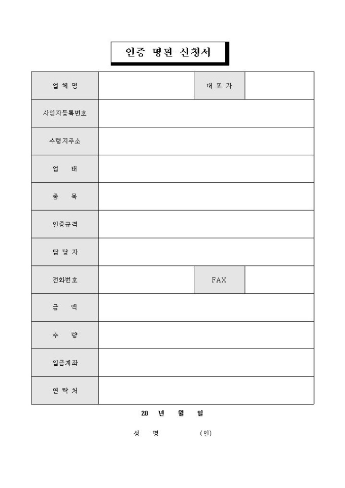 9,000원/월인증 명판을 신청할 때 사용하는 인증 명판 신청서 양식입니다. 업체명, 대표자, 사업자등록번호, 수령지주소, 업태, 종목, 인증규격, 담당자, 전화번호, 금액, 수량, 입급계좌, 연락처의 항목으로 구성되어있습니다.