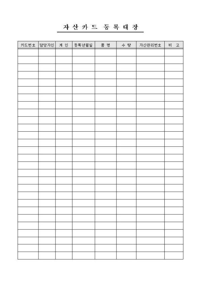 9,000원/월카드번호, 담당자인, 계인, 등록년월일, 품명, 수량, 자산관리번호, 비고의 항목으로 구성된 자산카드 등록대장 양식입니다.