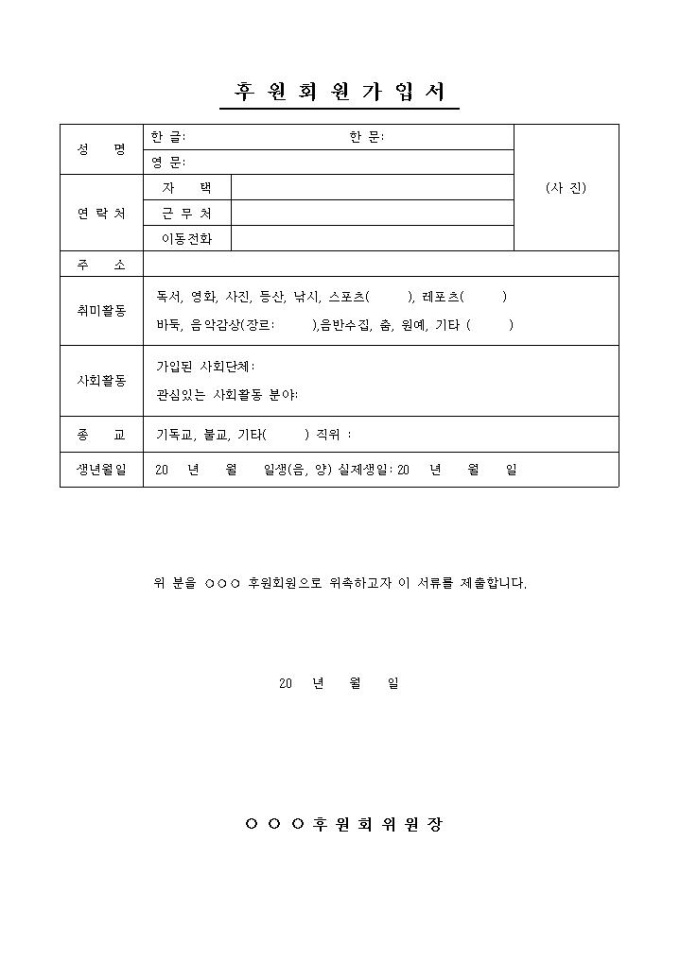 9,000원/월인적사항, 취미활동, 사회활동, 종교, 생년월일 등의 항목으로 구성되어있는 후원회원가입서 양식입니다.