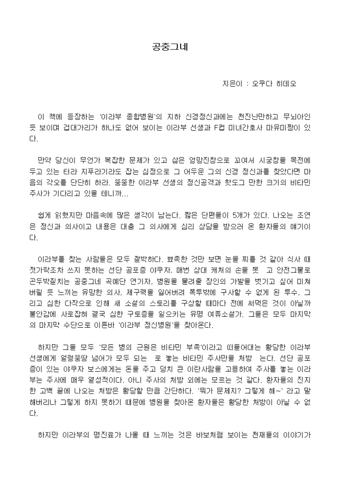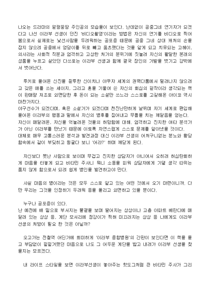 이 책에 등장하는 ´이라부 종합병원´의 지하 신경정신과에는 천진난만하고 무뇌아인 듯 보이며 겁대가리가 하나도 없어 보이는 이라부 선생과 F컵 미녀간호사 마유미짱이 있다.