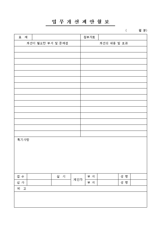 9,000원/월업무상 개선할 부분을 파악하여 개선을 제안하고자 할 때 사용하는 업무개선제안월보 양식입니다. 표제, 첨부자료, 개선이 필요한 부서 및 문제점, 개선의 내용 및 효과, 특기사항, 비고 등의 항목으로 구성되어있습니다.
