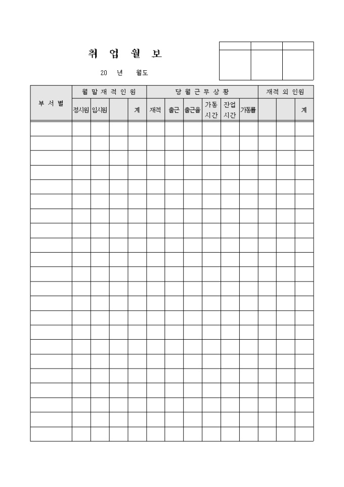 부서별로 취업과 관련된 내용을 기록/ 관리할 수 있는 취업월보 양식입니다. 부서별, 월말재적인원, 당월근무상황, 재적 외 인원 등의 항목으로 구성되어있습니다.