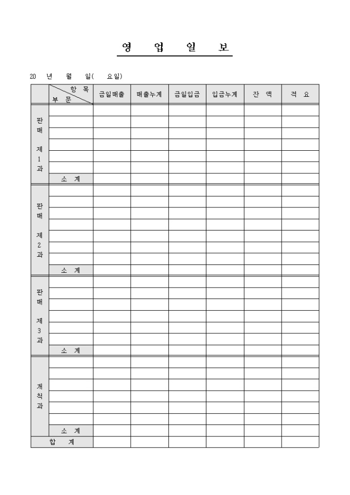 9,000원/월영업과 관련된 사항을 기록/ 관리할 수 있는 영업일보 양식입니다. 영업부서별로 금일매출, 매출누계, 금일입금, 입금누계, 잔액, 적요에 관한 내용을 기록할 수 있습니다.