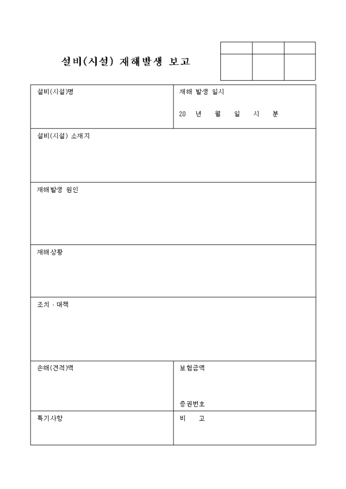 9,000원/월설비시설의 재해 발생 시 관련 내용을 보고하고자 할 때 사용하는 설비(시설) 재해발생 보고서 양식입니다. 설비(시설)명, 재해발생일시, 설비(시설)소재지, 재해발생원인, 재해상황, 조치/대책, 손해액, 보험금액, 특기사항, 비고 등의 항목으로 구성되어있습니다.