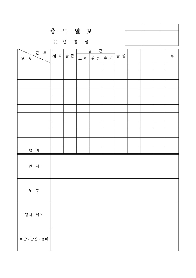 9,000원/월부서, 근무, 재적, 출근, 결근, 출장, % 등의 항목으로 구성되어있는 총무일보 양식입니다.