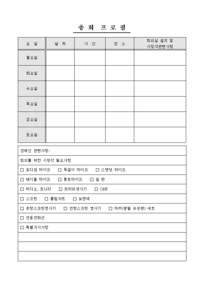 9,000원/월컨벤션 총회에 관한 프로필을 기록/ 관리할 수 있는 총회 프로필 양식입니다. 요일, 날짜, 시간, 장소, 회의실 설치 및 시청각관련사항, 장애인 관련사항 등의 항목으로 구성되어있습니다.