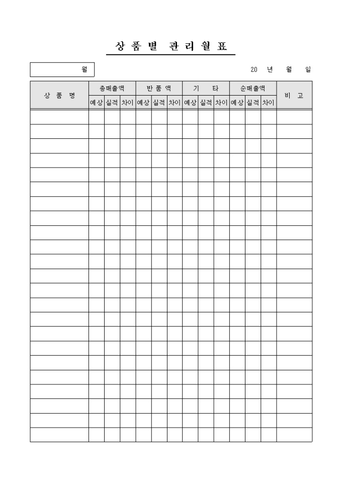월 단위로 상품과 관련된 사항을 기록/ 관리할 수 있는 상품별 관리월표 양식입니다. 상품명, 총매출액, 반품액, 기타, 순매출액, 비고 등의 항목으로 구성되어있습니다.