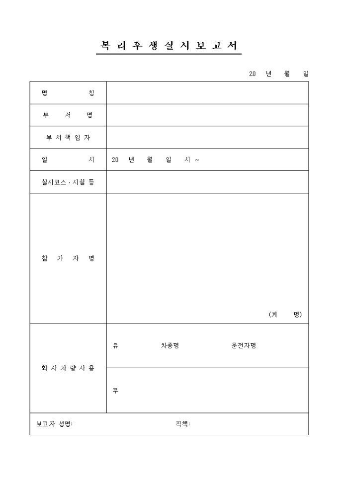 명칭, 부서명, 부서책임자, 일시, 실시코스, 참가자명, 희망차량사용, 보고자 등의 항목으로 구성되어있는 복리후생실시보고서 양식입니다.