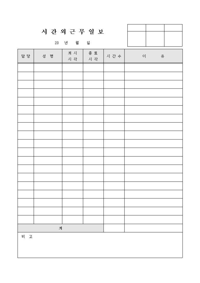 시간 외 근무에 관한 내역을 매일 기록/ 관리할 수 있는 시간외근무일보 양식입니다. 담당, 성명, 개시시각, 종료시각, 시간수, 이유의 항목으로 구성되어있습니다.