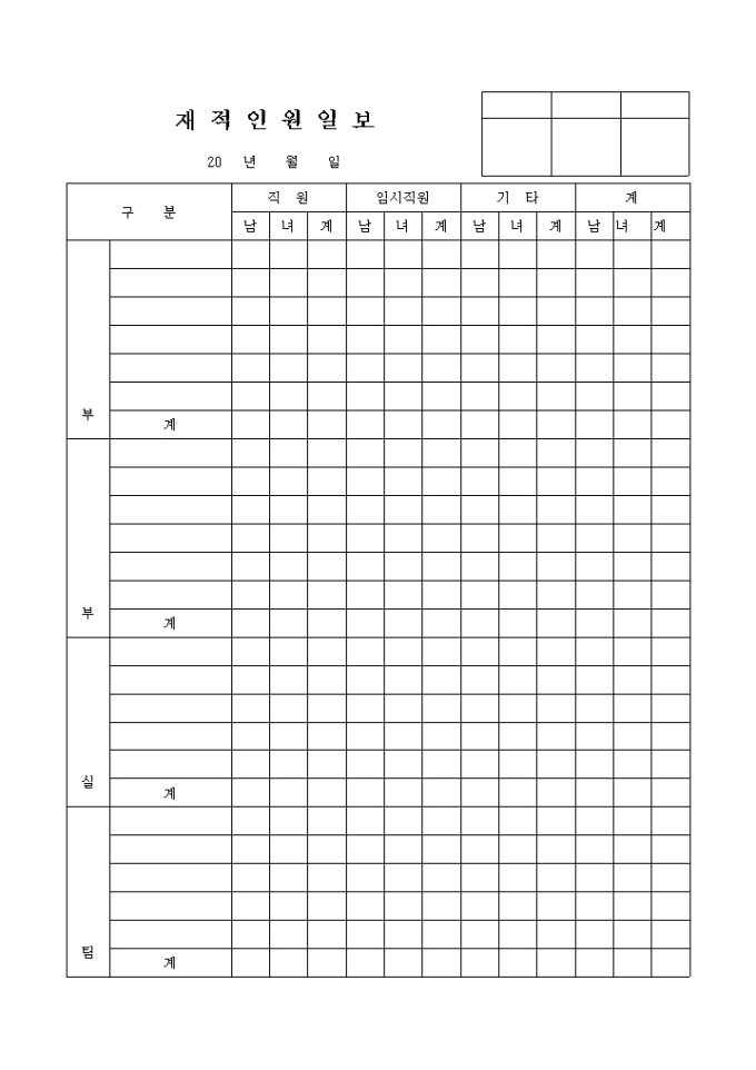재적인원에 대한 현황을 각 부서별로 기록/ 관리할 수 있는 재적인원일보 양식입니다. 구분, 직원, 임시직원, 기타, 계 등의 항목으로 구성되어있습니다.