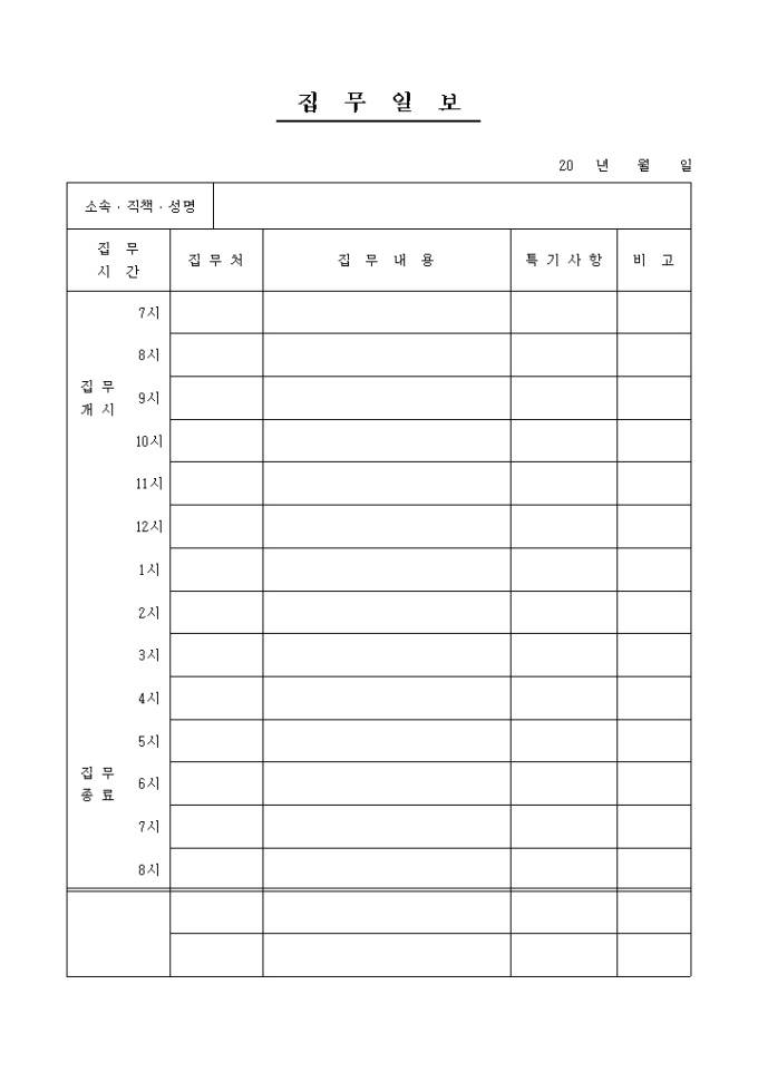 9,000원/월시간대별로 집무에 관한 내용을 기록/ 관리할 수 있는 집무일보 양식입니다. 집무시간, 집무처, 집무내용, 특기사항, 비고 등의 항목으로 구성되어있습니다.