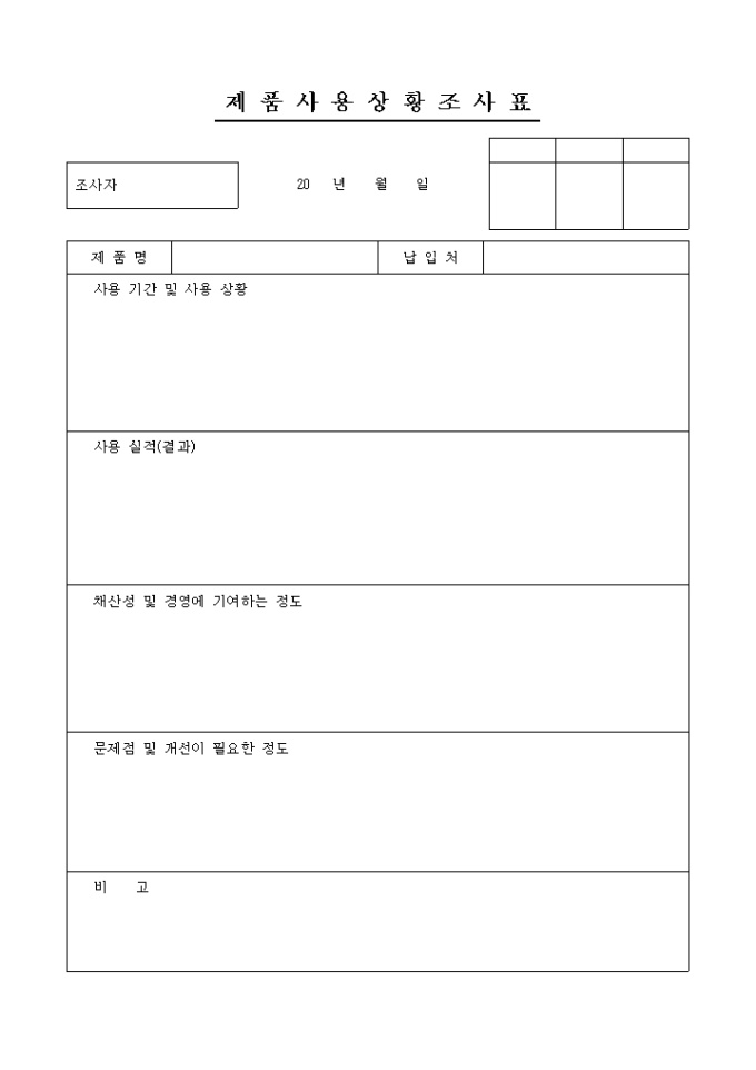 제품사용상황에 대해 기록/ 조사할 수 있는 제품상황조사표 양식입니다. 제품명, 납입처, 사용기간 및 사용상황, 사용실적, 채산성 및 경영에 기여하는 정도, 문제점 및 개선이 필요한 정도, 비고의 항목으로 구성되어있습니다.