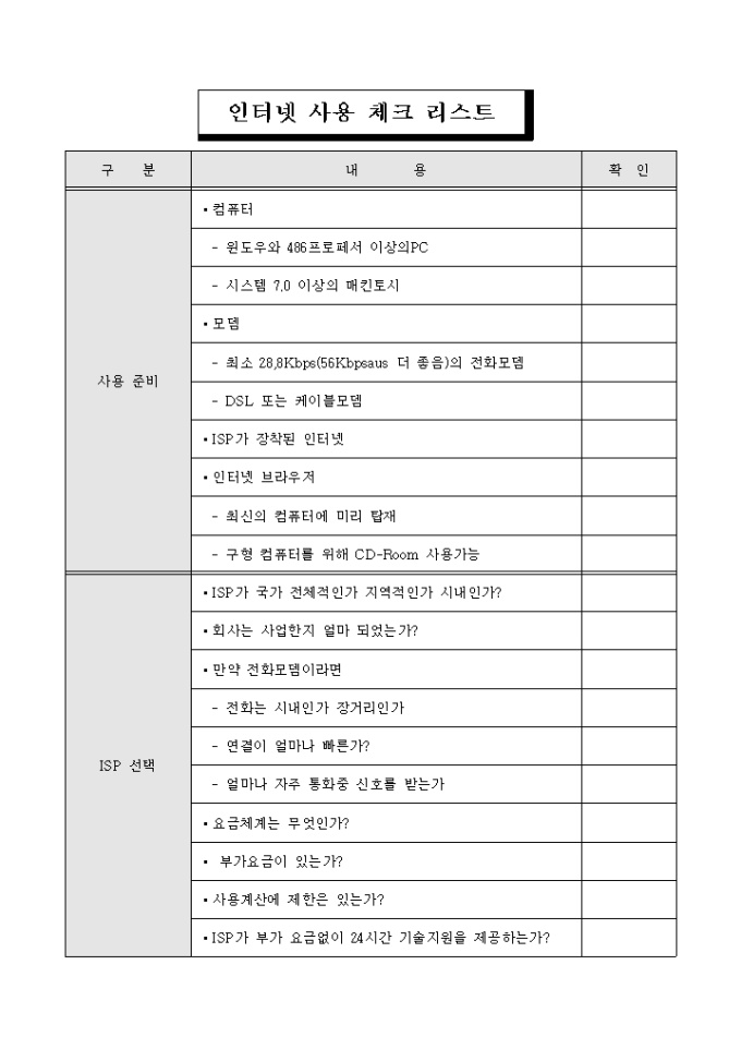 9,000원/월인터넷 사용과 관련된 사항을 체크/ 관리할 때 사용하는 인터넷 사용 체크 리스트 양식입니다. 사용준비, ISP선택에 대해 내용별로 체크하실 수 있습니다.