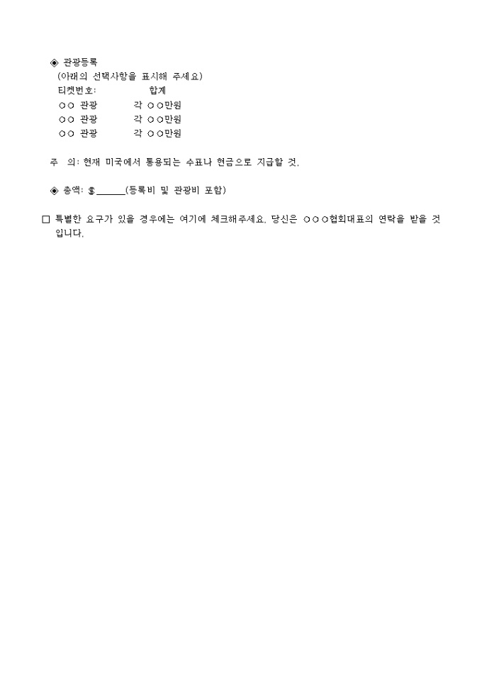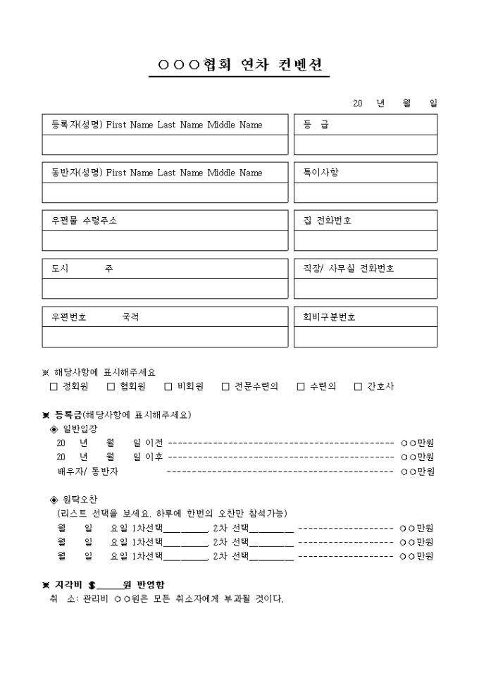 컨벤션 회의에 참가/ 등록하고자 할 때 사용하는 회의등록대장 양식입니다. 등록자(성명), 동반자(성명), 주소, 등록금, 지각비, 총액 등의 항목으로 구성되어있습니다.