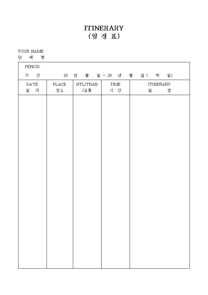 관광 일정을 기록/ 관리할 수 있는 관광일정표 양식입니다. 단체명, 기간, 일자, 장소, 교통, 시간, 일정의 항목으로 구성되어있습니다.