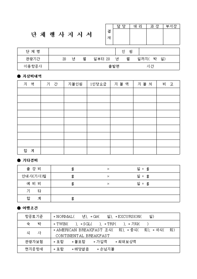 9,000원/월단체명, 관광기간, 이용항공사, 지상비내역, 기타경비, 여행조건 등의 항목으로 구성되어있는 단체행사지시서 양식입니다.