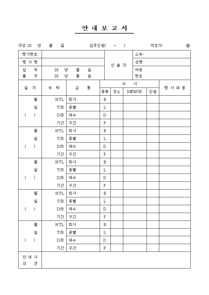 입국인원들의 안내 시 그 내용을 기록/ 보고할 수 있는 안내보고서 양식입니다. 행사번호, 행사명, 일자, 숙박, 교통, 식사, 행사내용, 안내사의견 등의 항목으로 구성되어있습니다.