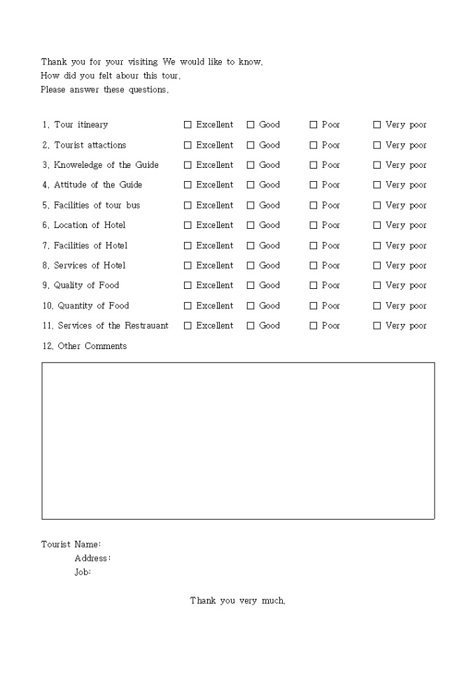 9,000원/월여행사가 여행자들의 의견을 듣고 수렴하고자 할 때 사용하는 영문으로 된 여행설문서 양식입니다.
