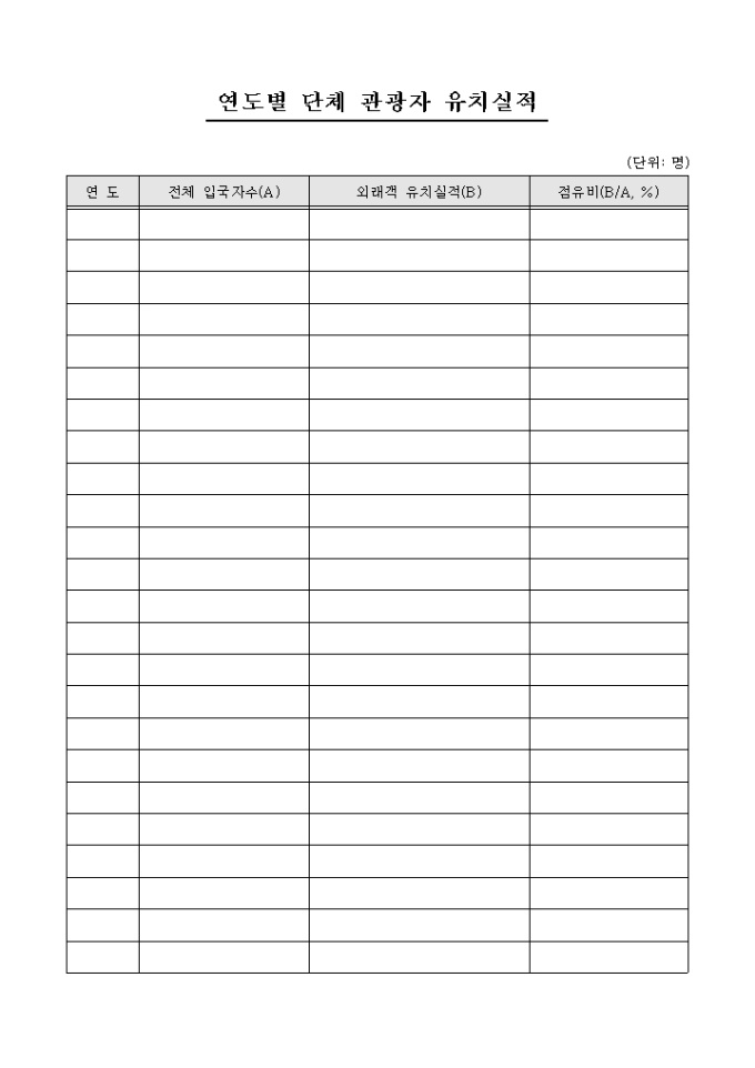 9,000원/월연도별로 단체 관광자의 유치 실적을 기록/ 관리할 수 있는 연도별 단체 관광자유치실적표 양식입니다. 연도, 전체 입국자수, 외래객 유치실적, 점유비의 항목으로 구성되어있습니다.