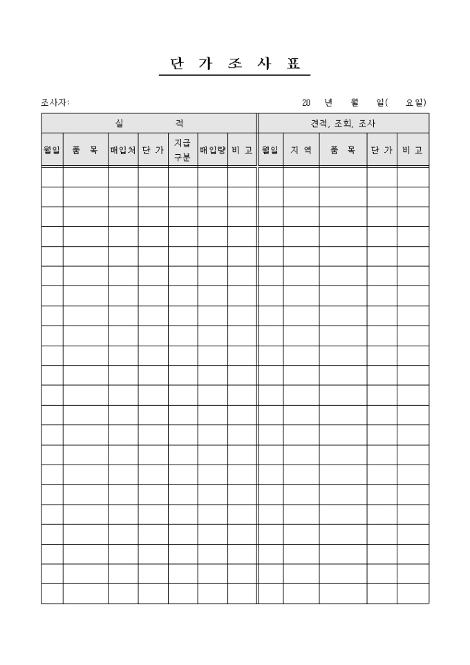 실적과 견적, 조회, 조사에 대한 사항을 조사/기록할 수 있는 단가조사표 양식입니다.