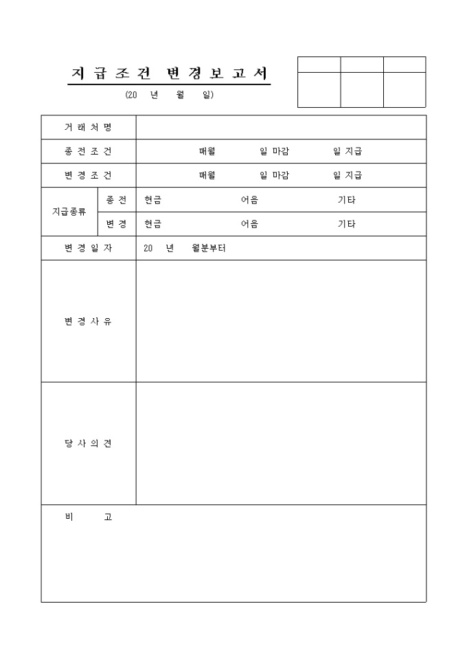 지급조건의 변경 사항을 기록/ 보고할 수 있는 지급조건 변경보고서 양식입니다. 거래처명, 종전조건, 변경조건, 지급종류, 변경일자, 변경사유, 당사의견, 비고 등의 항목으로 구성되어있습니다.