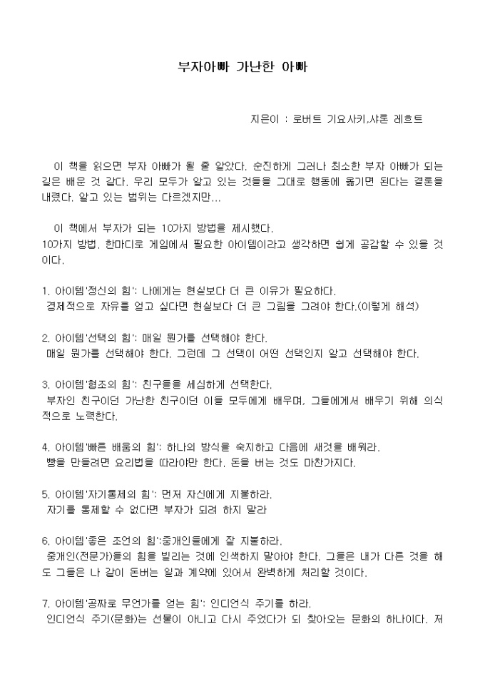 이 책을 읽으면 부자 아빠가 될 줄 알았다. 순진하게 그러나 최소한 부자 아빠가 되는 길은 배운 것 같다. 우리 모두가 알고 있는 것들을 그대로 행동에 옮기면 된다는 결론을 내렸다. 알고 있는 범위는 다르겠지만...