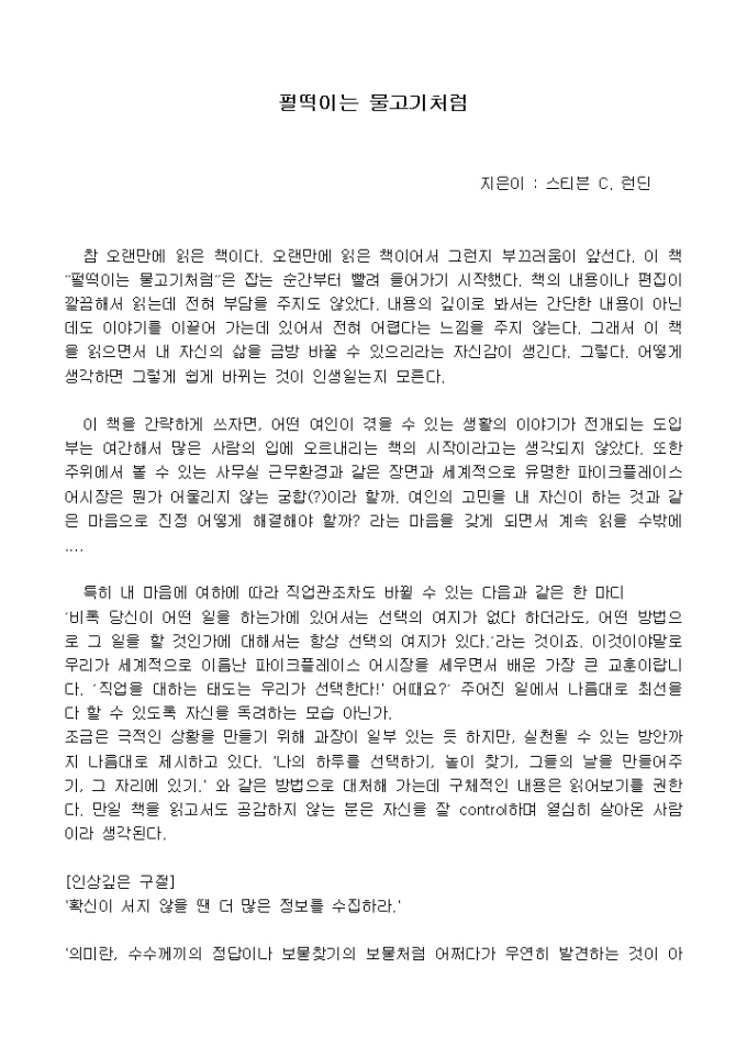˝펄떡이는 물고기처럼˝은 잡는 순간부터 빨려 들어가기 시작했다. 책의 내용이나 편집이 깔끔해서 읽는데 전혀 부담을 주지도 않았다. 내용의 깊이로 봐서는 간단한 내용이 아닌데도 이야기를 이끌어 가는데 있어서 전혀 어렵다는 느낌을 주지 않는다. 그래서 이 책을 읽으면서 내 자신의 삶을 금방 바꿀 수 있으리라는 자신감이 생긴다.