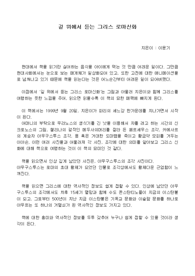 이점에서 ´길 위에서 듣는 그리스 로마신화´는 그림과 아울러 지은이와 함께 그리스를 여행하는 듯한 느낌을 주어, 읽으면 읽을수록 이 책의 묘한 매력에 빠지게 된다.