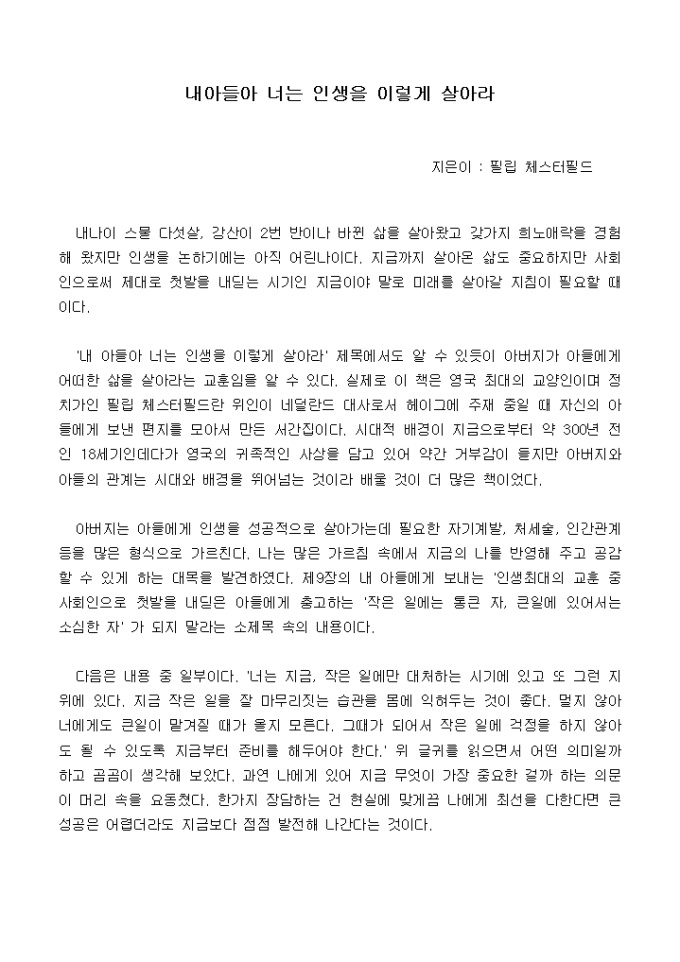 내 아들아 너는 인생을 이렇게 살아라´ 제목에서도 알 수 있듯이 아버지가 아들에게 어떠한 삶을 살아라는 교훈임을 알 수 있다. 실제로 이 책은 영국 최대의 교양인이며 정치가인 필립 체스터필드란 위인이 네덜란드 대사로서 헤이그에 주재 중일 때 자신의 아들에게 보낸 편지를 모아서 만든 서간집이다.