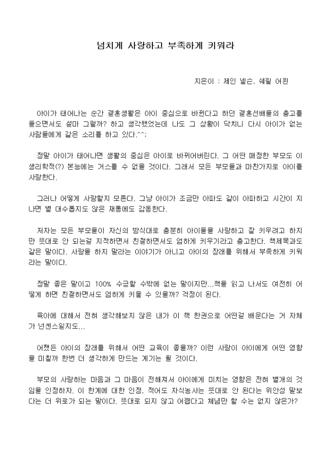 저자는 모든 부모들이 자신의 방식대로 충분히 아이들을 사랑하고 잘 키우려고 하지만 뜻대로 안 되는걸 지적하면서 친절하면서도 엄하게 키우기라고 충고한다.