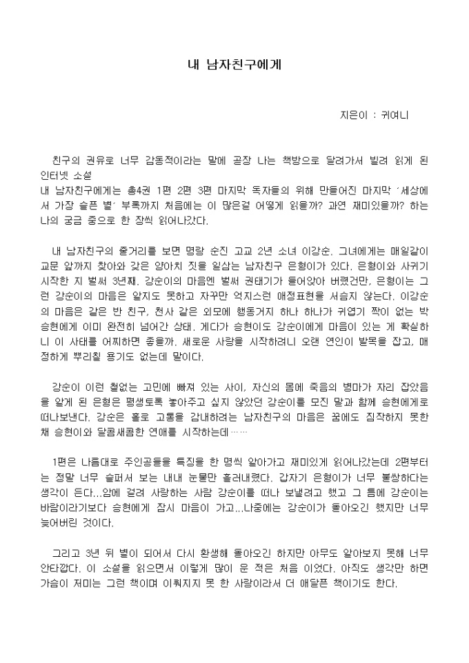 친구의 권유로 너무 감동적이라는 말에 곧장 나는 책방으로 달려가서 빌려 읽게 된 인터넷 소설