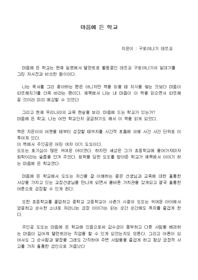 도또는 호기심이 많은 귀여운 아이였다. 하지만 세상은 그가 초등학교에 들어가자마자 퇴학이라는 슬픔을 안겨 주었다. 퇴학을 당한 도또를 받아준 학교가 제목에서 이야기 하는 마음에 든 학교였다.