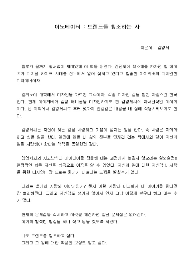 첨부터 끝까지 쉴새없이 재미있게 이 책을 읽었다. 간단하게 책소개를 하자면 빌 게이츠가 디지털 라이프 시대를 선두에서 열어 젖히고 있다고 칭송한 아이리버의 디자인한 디자이너이자