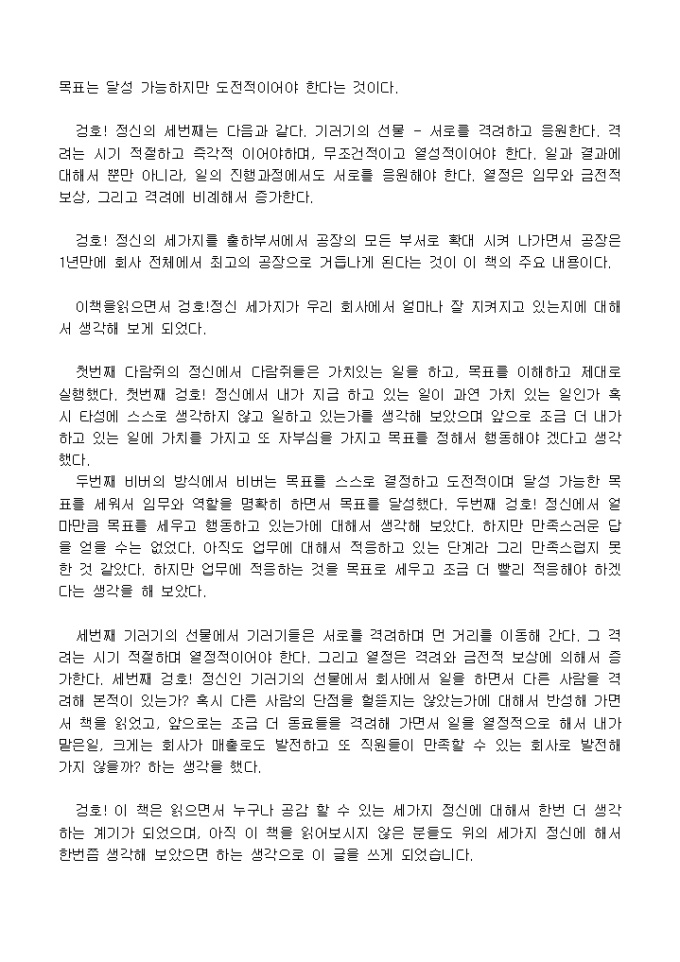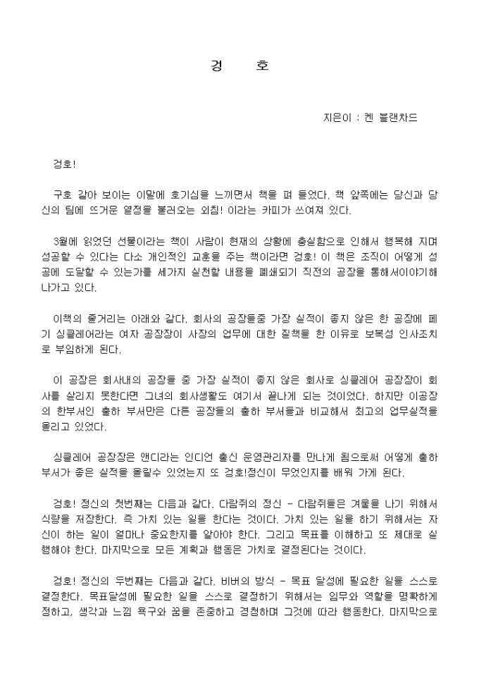 구호 같아 보이는 이말에 호기심을 느끼면서 책을 펴 들었다. 책 앞쪽에는 당신과 당신의 팀에 뜨거운 열정을 불러오는 외침! 이라는 카피가 쓰여져 있다.