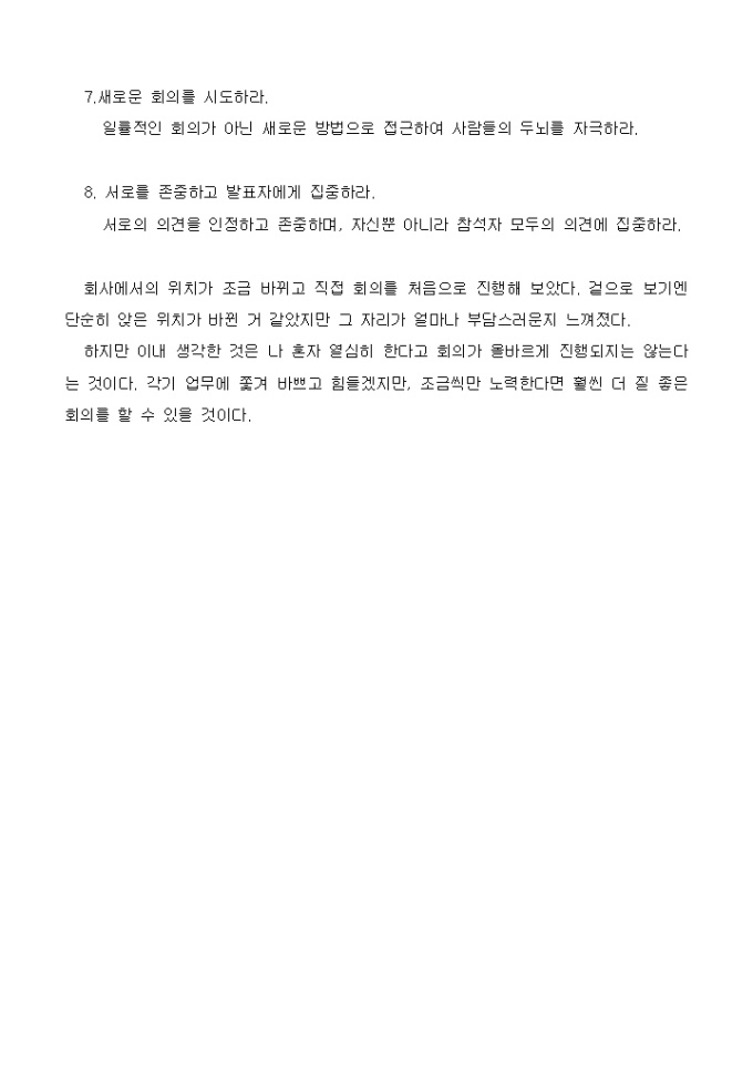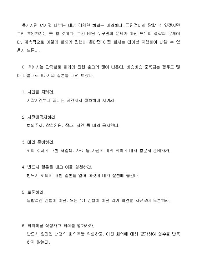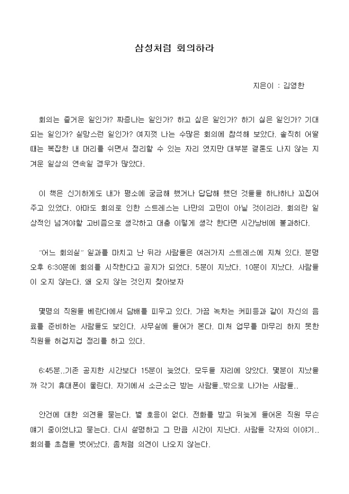 회의는 즐거운 일인가? 짜증나는 일인가? 하고 싶은 일인가? 하기 싫은 일인가? 기대 되는 일인가? 실망스런 일인가? 여지껏 나는 수많은 회의에 참석해 보았다. 솔직히 어떨때는 복잡한 내 머리를 쉬면서 정리할 수 있는 자리 였지만 대부분 결론도 나지 않는 지겨운 일상의 연속일 경우가 많았다.